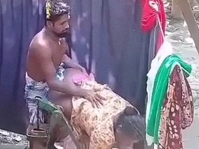 Boudi from a rural Indian village strips down and bathes naked