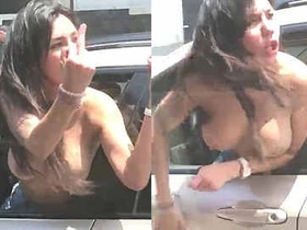 Wild topless girl shouts and screams in public while driving a car