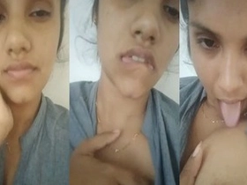Cute desi girl pleasures herself with fingers and tongue in selfie video